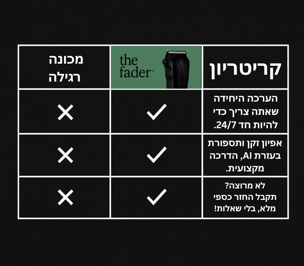 לנו נמאס, נמאס שהגברים בישראל כפופים למספרות ומבואסים! עם ™TheFader אתה תשלוט על הזקן שלך, אתה תהיה חד כל הזמן ולא תרגיש מוזנח בין התספורות, תוכל לחכות יותר בין כל תספורת ולחסוך כסף ותרגיש מדהים.